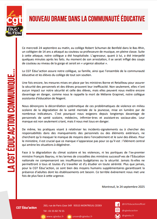 La CGT Éduc’action assure notre collègue, sa famille, ainsi que l’ensemble de la communauté éducative et les élèves du collège de tout son soutien.