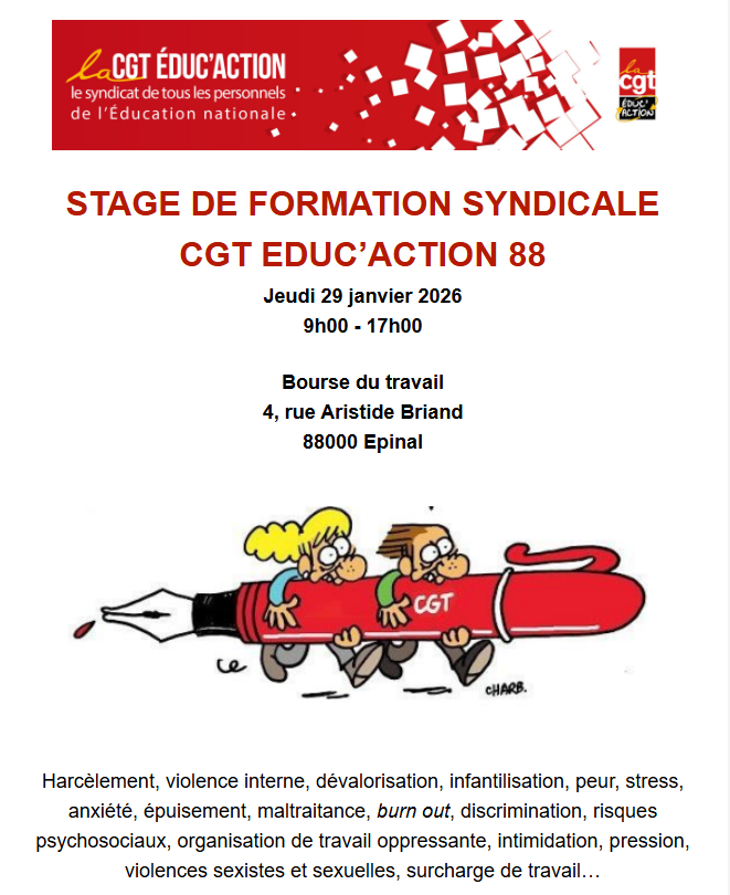 La CGT Educ’aciton 88 organise à Epinal, le 29 janvier 2026, de 9h à 17h, une journée de formation syndicale.