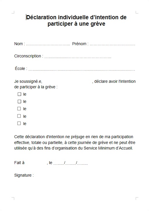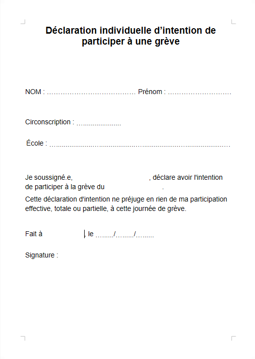 Vous trouverez ci dessous un modèle de déclaration d’intention de grève à envoyer à l’IEN.