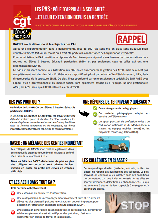 Le PAS est présenté comme la substitution aux PIAL en ce qui concerne le gestion des AESH, mais cela n’est pas complètement vrai dans les faits. En théorie, ce dispositif est piloté par le·la chef·fe d’établissement, l’IEN, le·la directeur·trice de la structure ESMS. De plus, il est coordonné par un·e enseignant·e spécialisé·e (OU PAS!) avec l’appui d’un·e professionnel·le du médico-social. Sont également associé·es à l’équipe, un·une gestionnaire AESH, les AESH ainsi que l’AESH référent·e et les ERSEH.